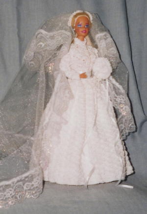 The tulle I used for the veil is shimmery. The lace edging is hand-sewn to the tulle. Her bouquet is a string of white lilies. Since they are white, they do not show up in this picture I did not make the flowers, I was able to find ready-made |